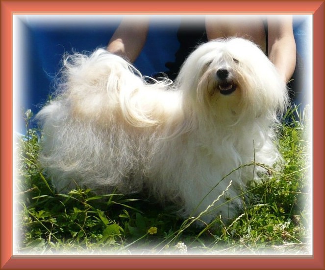 Bonitační posudek Typická středně velká fena, vyrovnaná a temperamentní, PLNOCHRUPÁ, skus nůžkový, hlava typická dle standardu, oči tmavé, veliké mandlové, krk dle standardu, hřbet pevný a rovný, bedra mírně klenutá, záď spáditá, břicho vtažené, ocas správně nasazen i nesen, výborné úhlení předních i zadních končetin, výborná pigmentace nosu i sliznic, srst měkká, zvlněná barvy krémová, výborně se předvádí. |